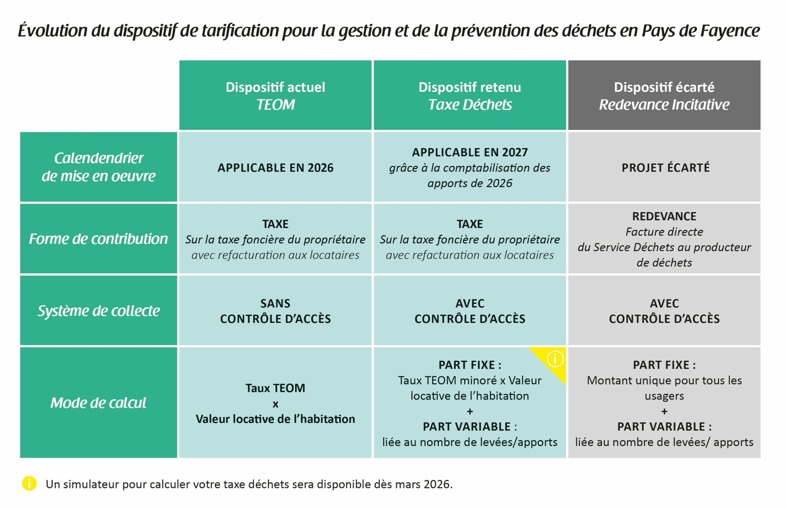 La Redevance Incitative ne sera pas mise en œuvre sur le territoire du Pays de Fayence. Le dispositif actuellement retenu par les élus communautaires est la taxe déchets, votée en Conseil communautaire le 10 décembre 2025, et applicable à compter de 2027 avec comptabilisation des levées et apports dès le 1er janvier 2026.