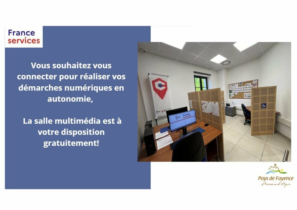France Services dispose d’une salle informatique en accès libre. Elle est à votre service pour vos démarches administratives ou la consultation de sites de services publics.